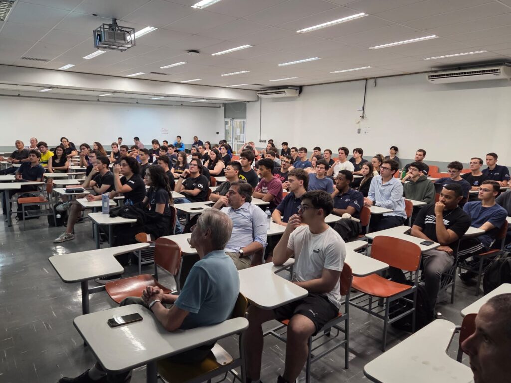 Sala cheia para a aula “Carreira de Engenharia e Esporte a Motor”, ministrada pelo engenheiro e Doutor, Felipe Marchesin (Nov. 4/ 2025)